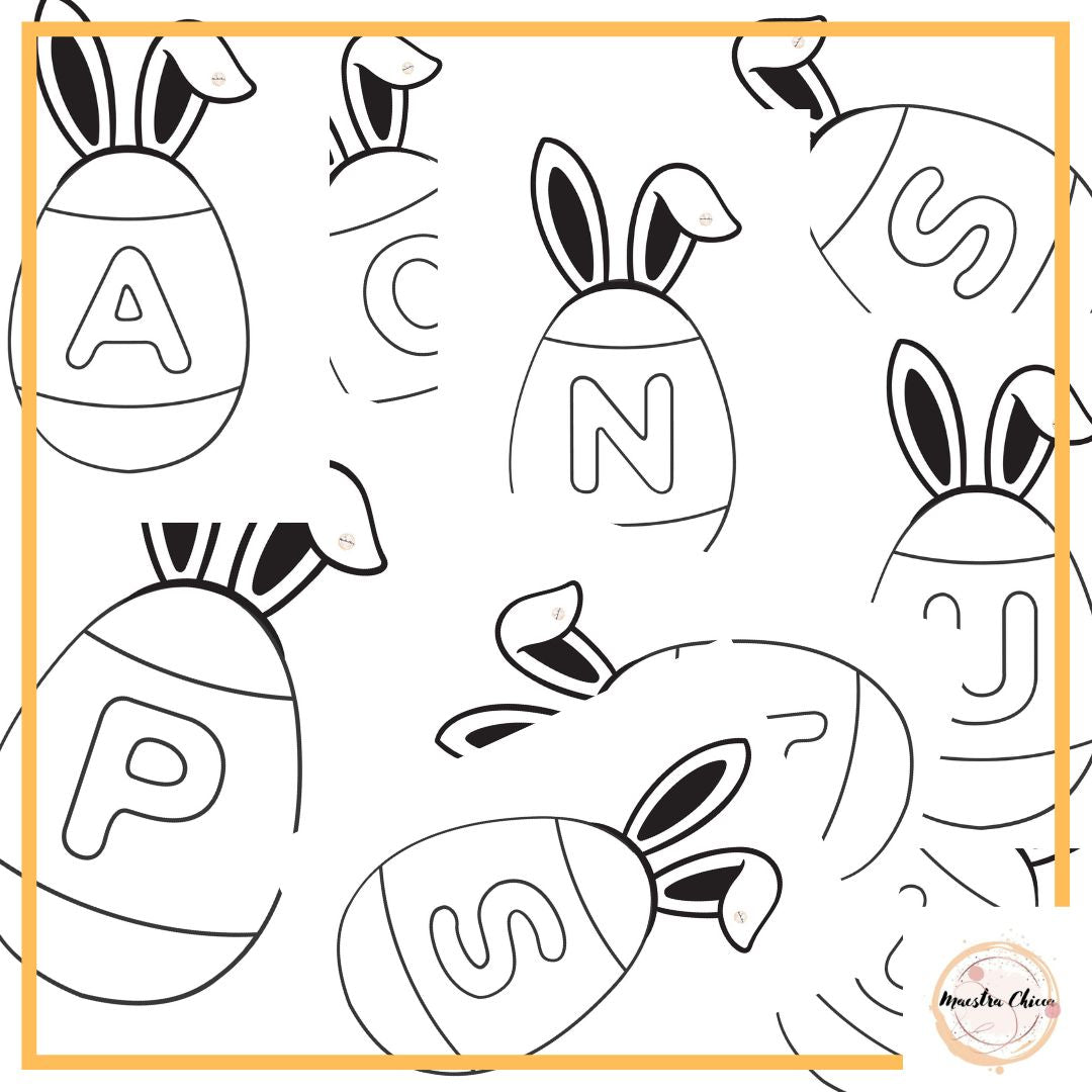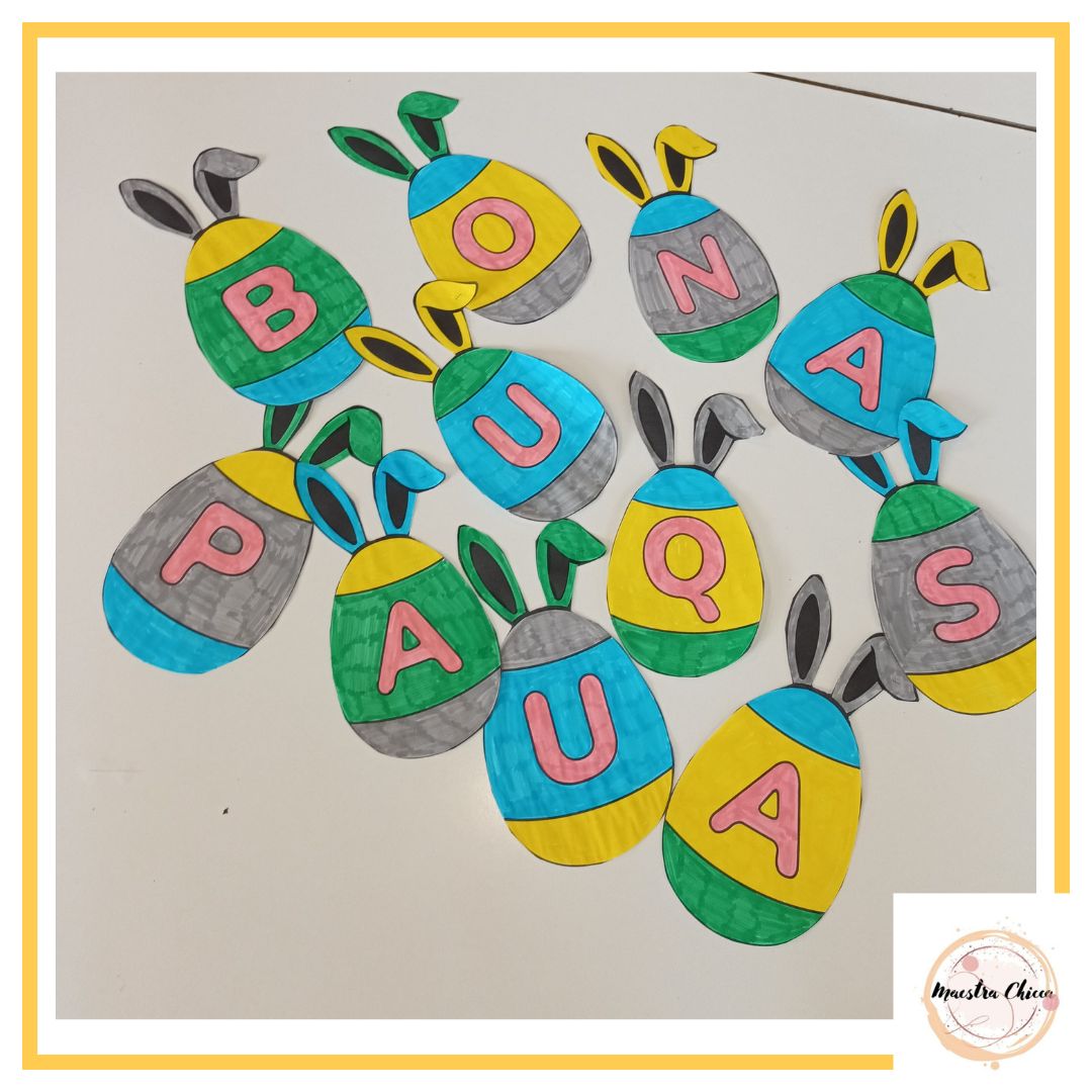 Nel PDF trovi le uova di Pasqua con le orecchie da coniglio con all'interno le lettere per formare la scritta BUONA PASQUA.