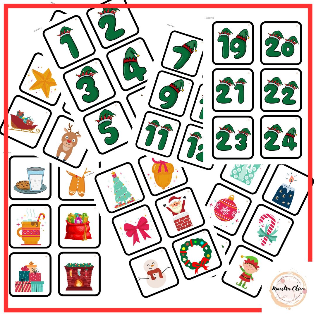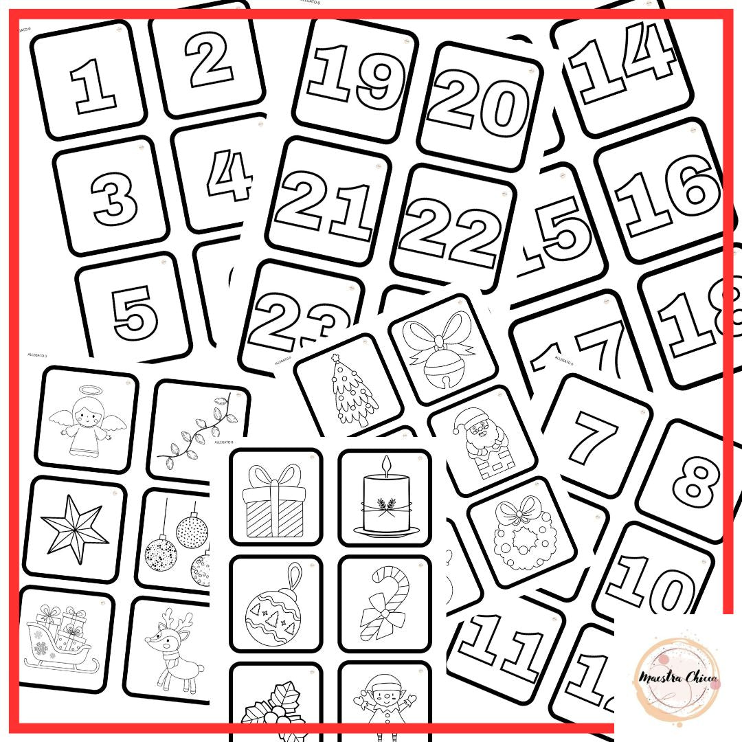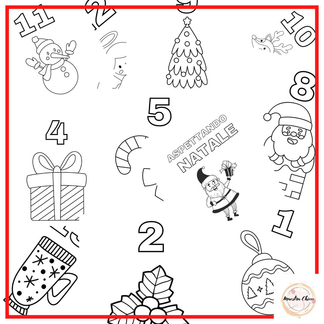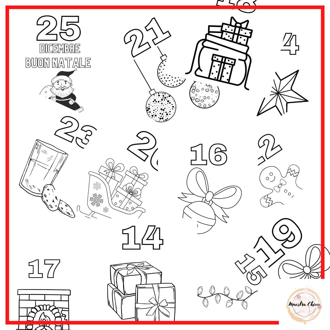 - 24 card con elementi natalizi per la costruzione del calendario sia a colori che da colorare