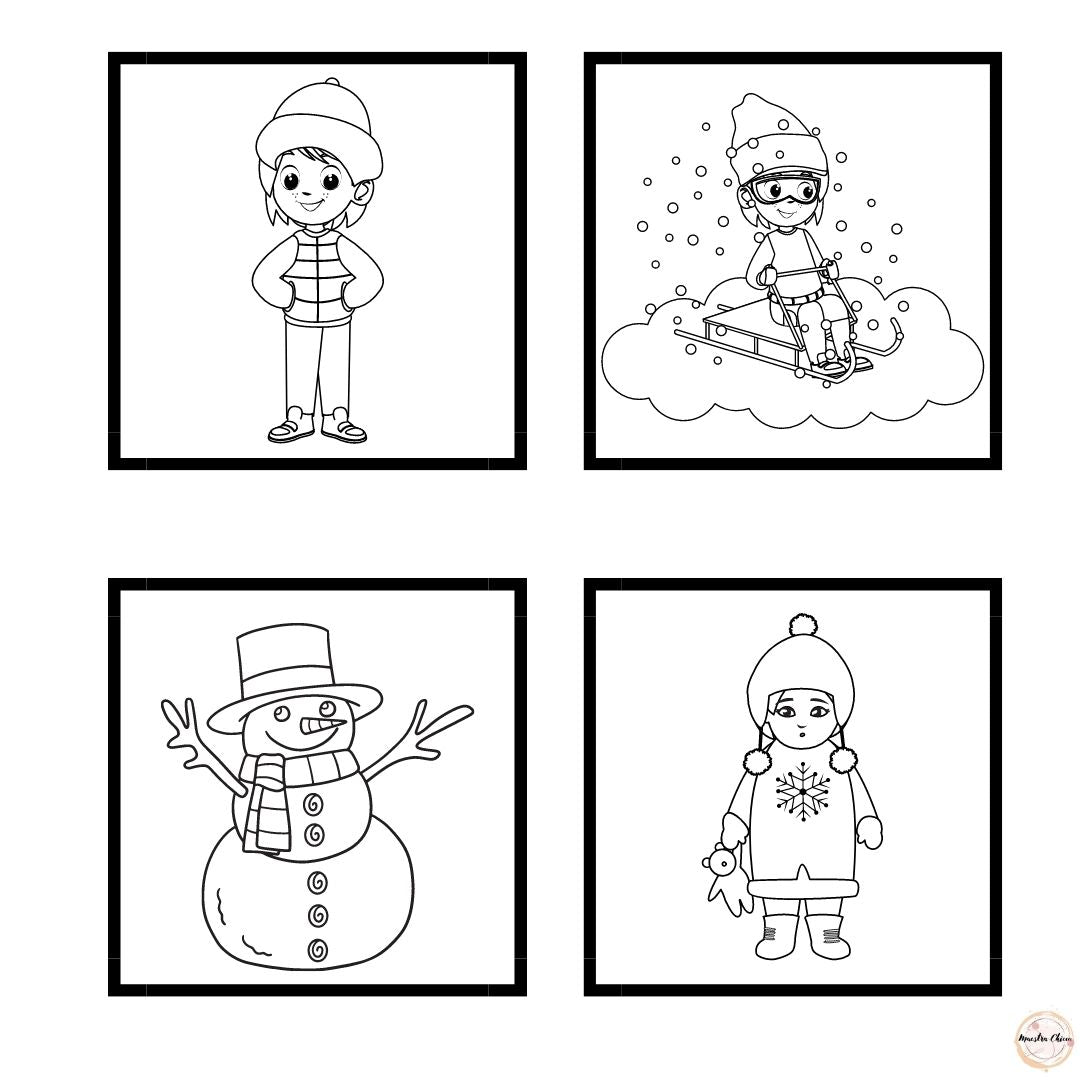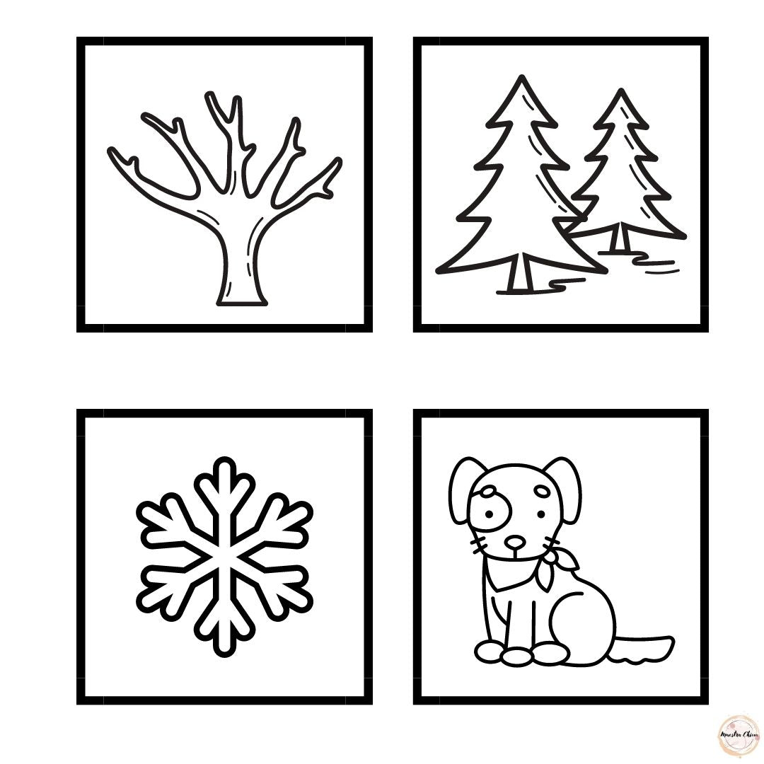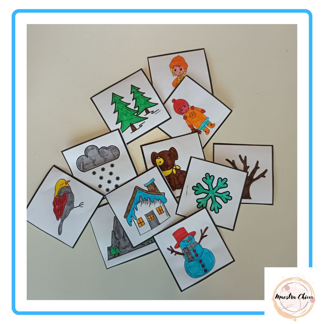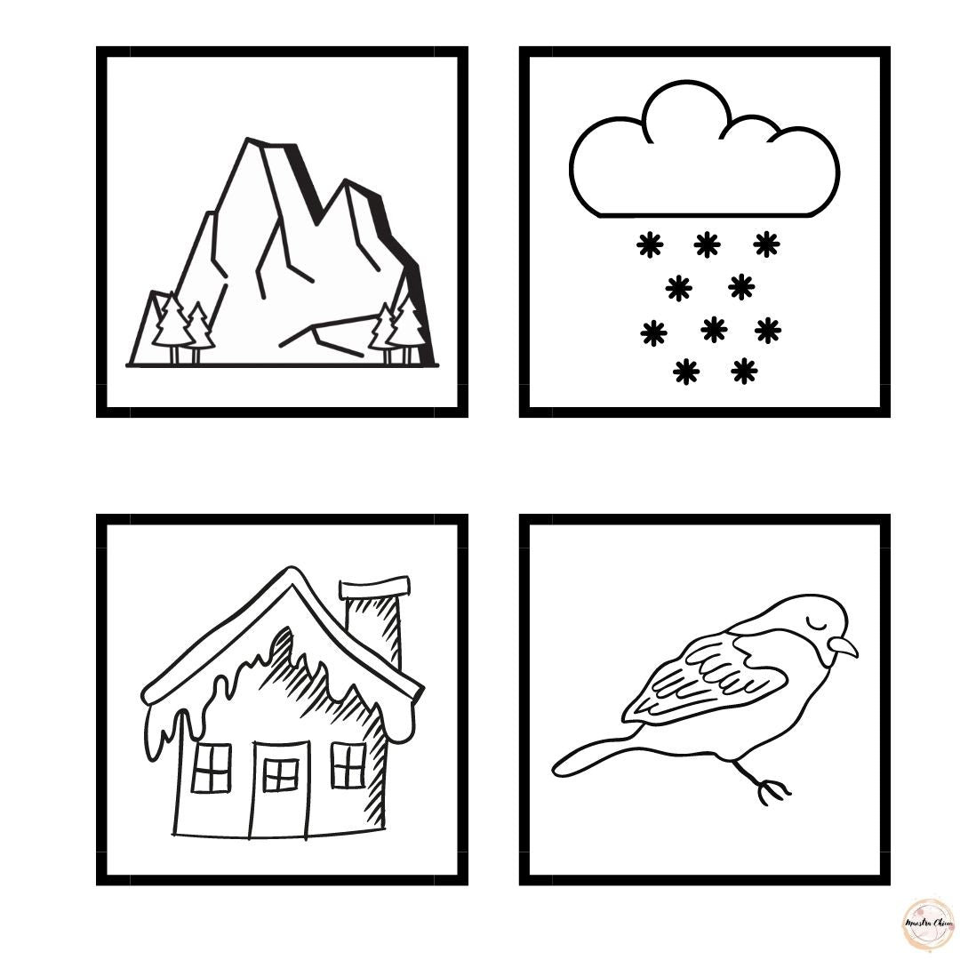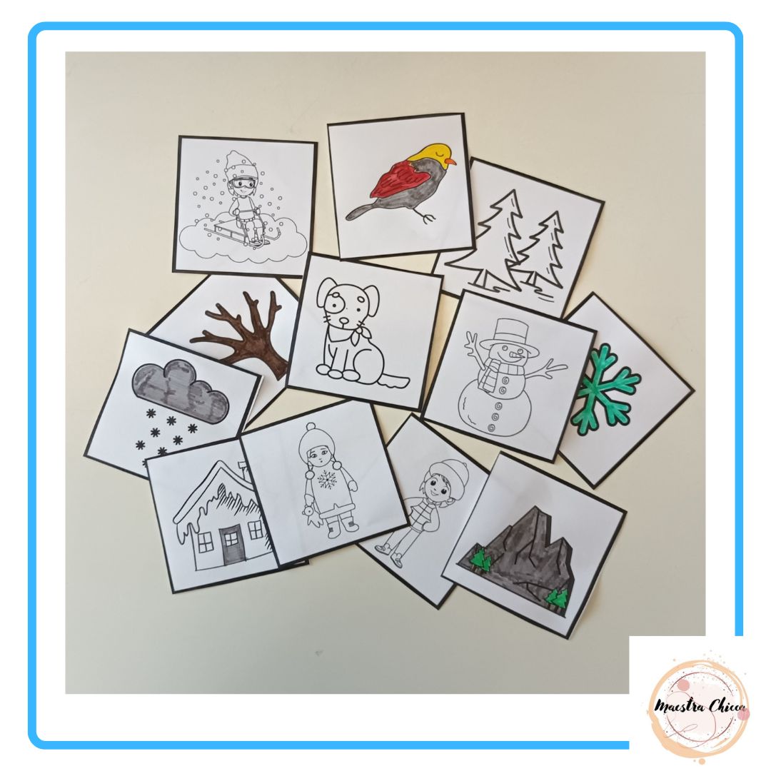 Disponi le card sul tavolo in modo che non siano visibili e consegna ad ogni alunno un foglio. A turno gli alunni girano una card e tutti devono disegnare l'oggetto pescato. Si procede così fino a che tutte le card sono finite e ogni alunno avrà disegnato e poi colorato il proprio paesaggio invernale.