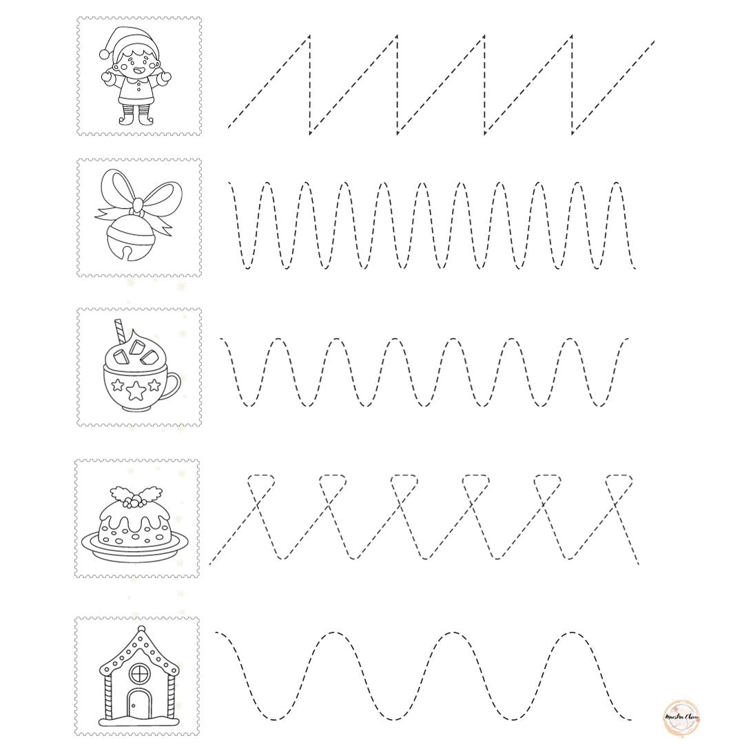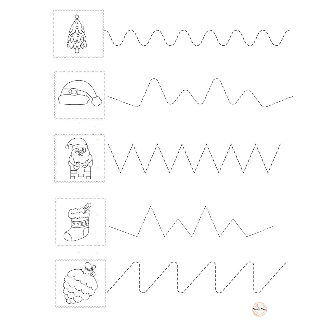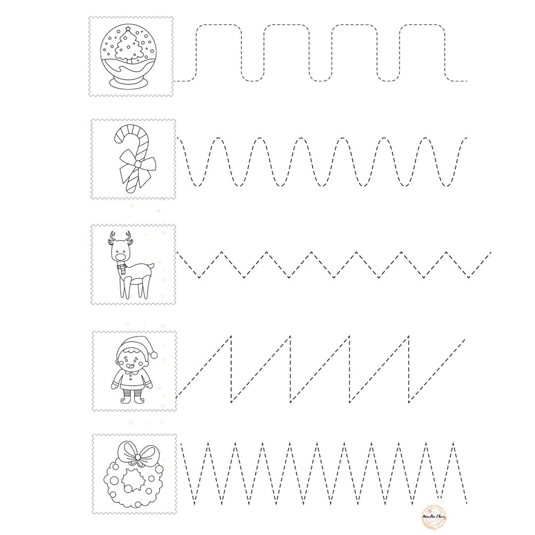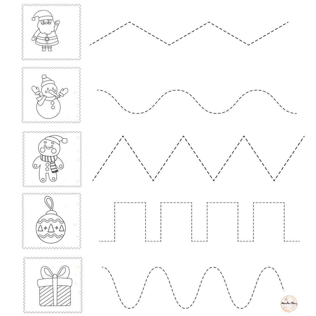 Piccolo PDF con elementi natalizi da colorare accompagnati da diversi tipi di linee da ripassare.