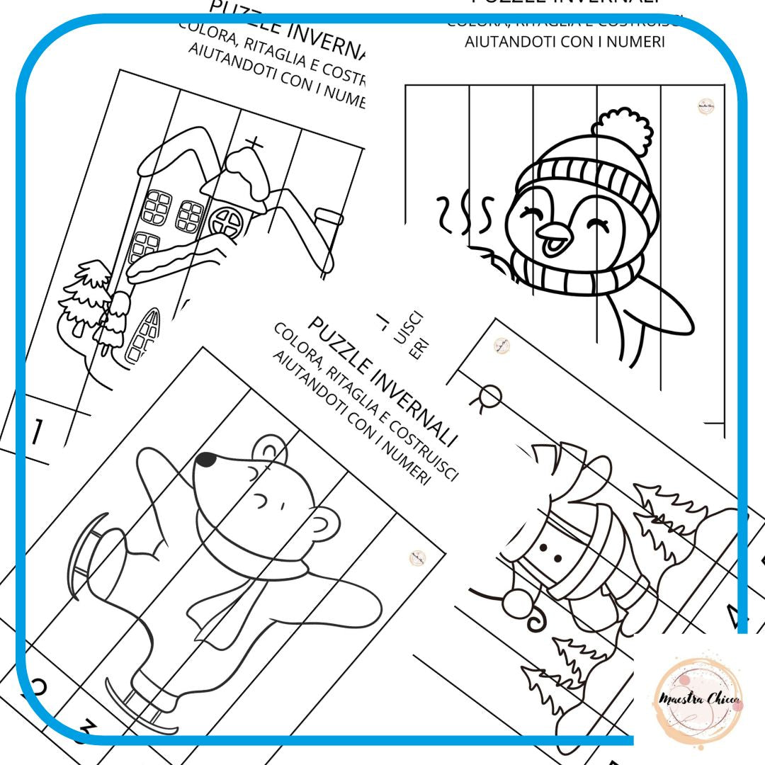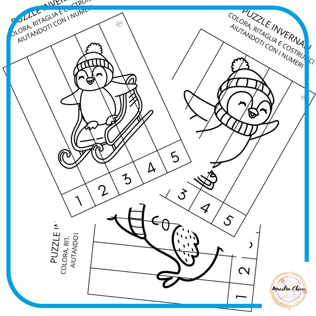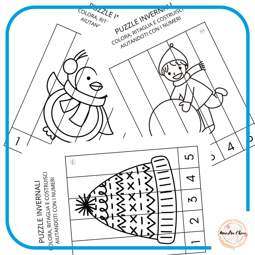 In questo PDF trovi 10 puzzle a tema inverno da colorare, ritagliare e costruire. I bambini possono aiutarsi anche mettendo in sequenza i numeri dall' 1 al 5.